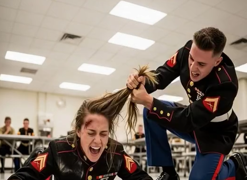 At Camp Hawthorne, the dining facility had its own rhythm—boots, chatter, trays sliding, someone yelling for hot sauce. But after that shove, the whole room went quiet in a way that felt unnatural. Forks froze midair. Chairs stopped scraping. Dozens of Marines turned at once.