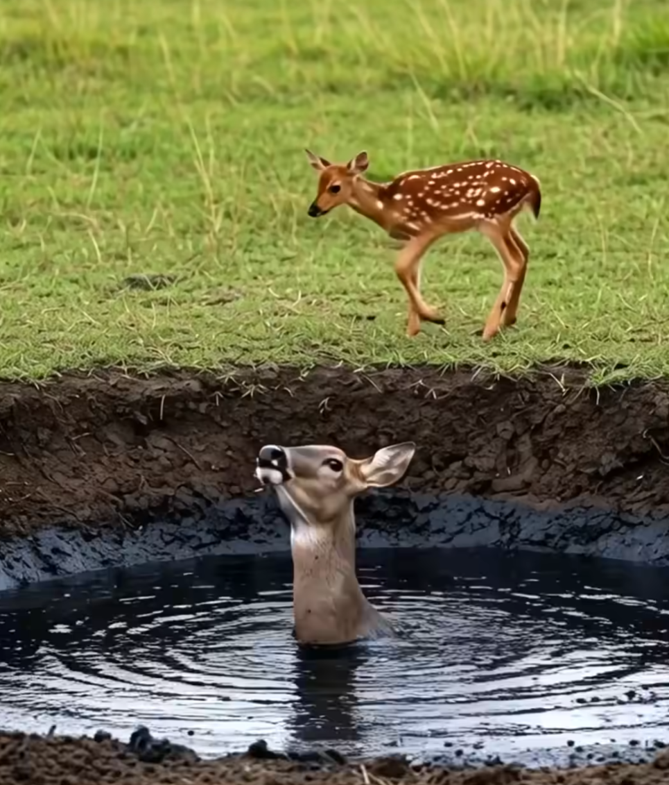 The silence broke as help rushed toward them. The ground trembled with movement, ropes, hands, urgency. The fawn stepped back—but didn’t go far.