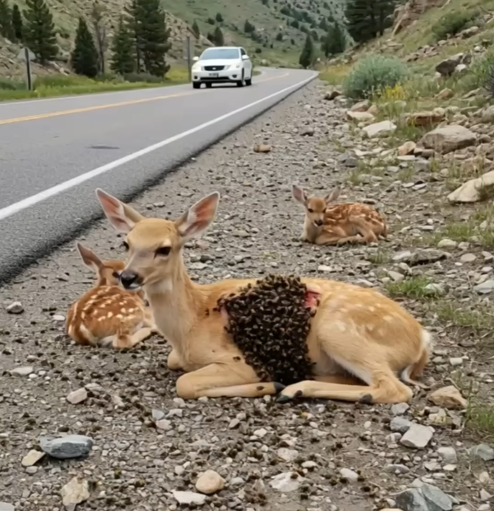 Carefully, gently, he guided the fawns away from the edge of the road. Step by step, moving them toward safety, away from the danger they didn’t understand.